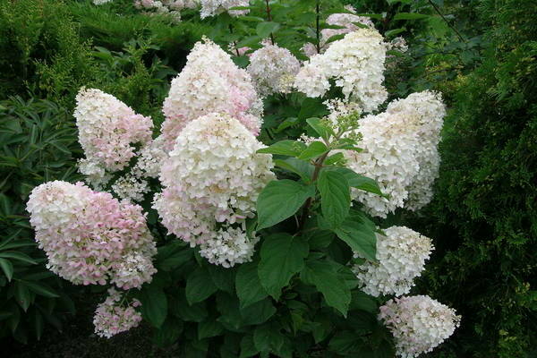 - Цветы: крупные, плотные метелки, сначала кремово-белые, затем приобретают легкий розоватый оттенок.