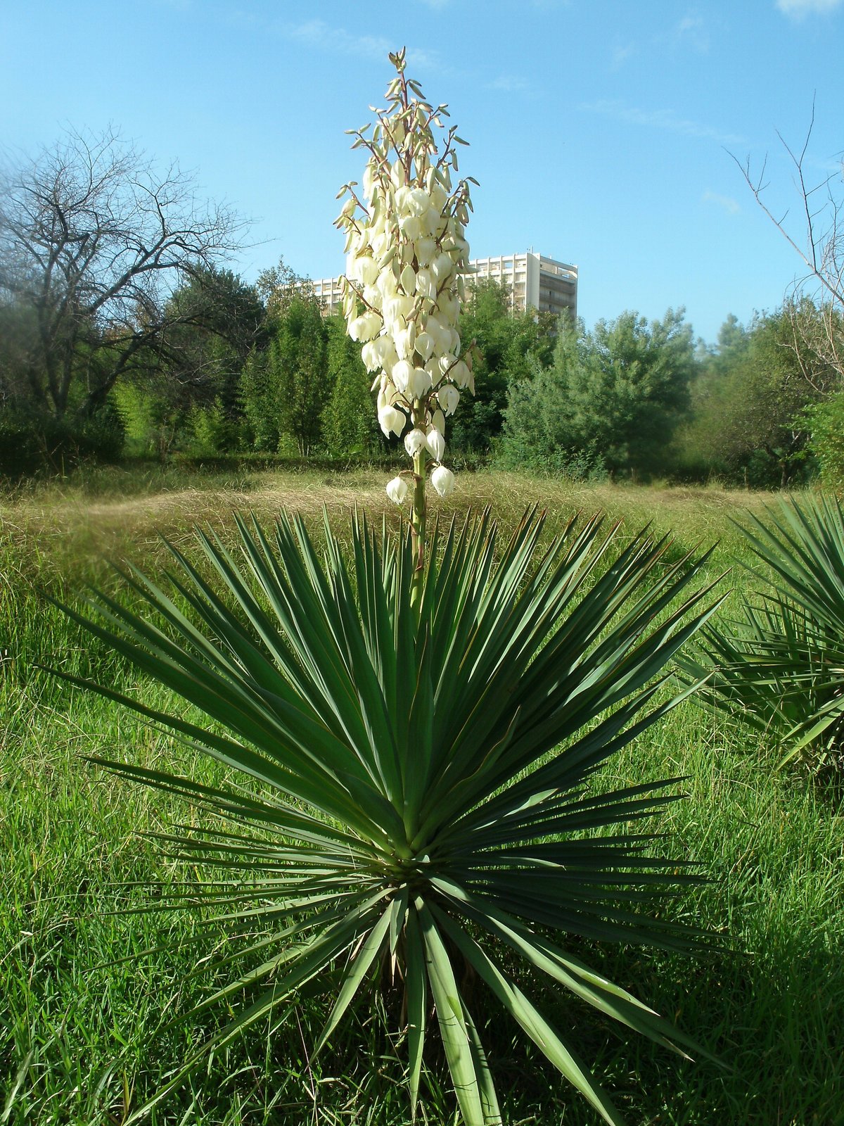 Юкка Узколистная (Yucca filamentosa) — это эффектное и неприхотливое растение, которое станет настоящим украшением вашего сада. Этот многолетний вечнозеленый кустарник отличается узкими, мечевидными листьями, собранными в розетку, и высокими цветоносами, на которых распускаются крупные белые цветы.